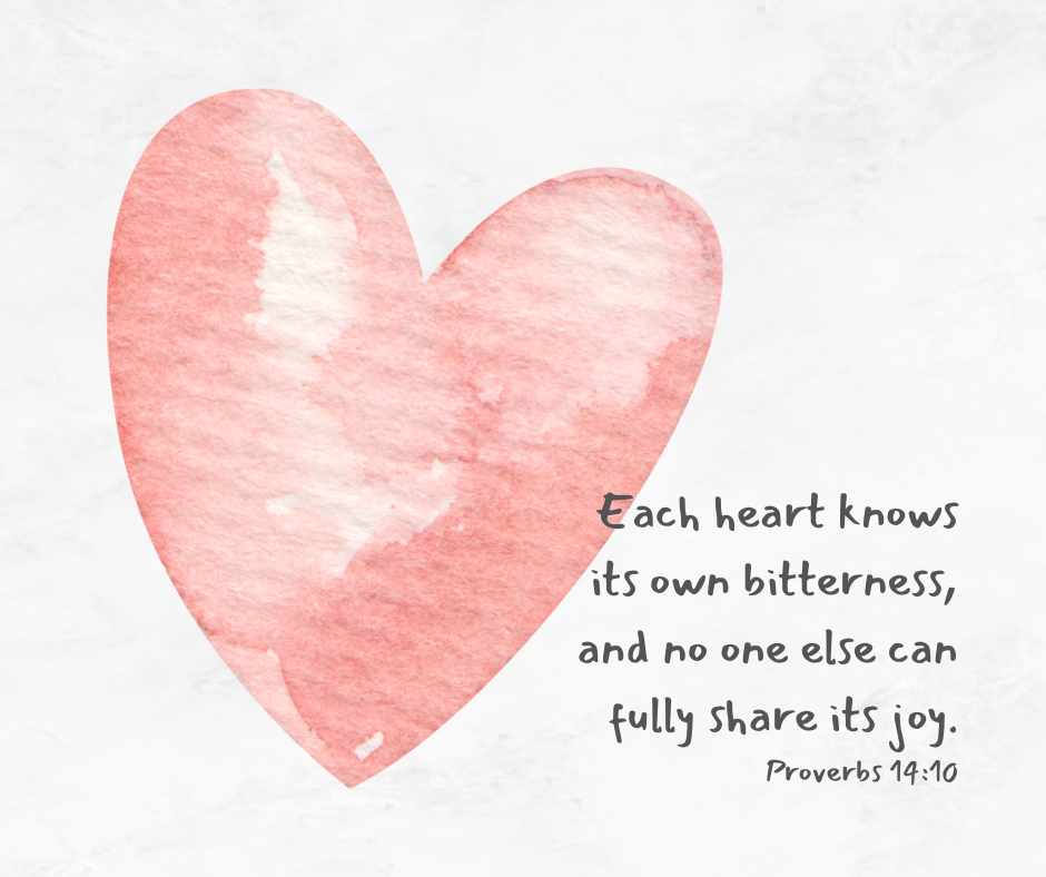 No one can understand what lies in someone else’s heart, whether bitterness or joy; we have emotions personal to us. When I lost my nephew, my pain differed from everyone else’s who knew him; we all grieved differently. The day I married Ron, joy overflowed my heart, unique to me after the long wait for my mate.