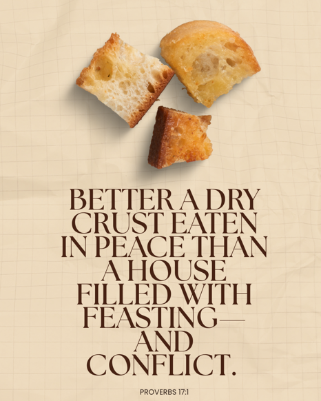 People fight over stuff. Feelings like envy, greed, and jealousy rise when someone thinks they haven’t received their fair share. Peace over prosperity means a poor home filled with harmony far outweighs a house full of conflict because of affluence. Relationships matter more than material things, but often, we prioritize our possessions over our connections with others.