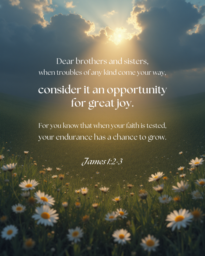 Rejoicing during trials doesn’t come naturally to anyone. When people have their faith tested, it purifies them, drawing them closer to God. Whether troubles from without or struggles from within, such as temptations, they give us a choice of how we approach them. Considering them as an opportunity for great joy happens when we keep our eyes on the Savior, trusting that whatever the situation, He will use it for His good and refine us through it.