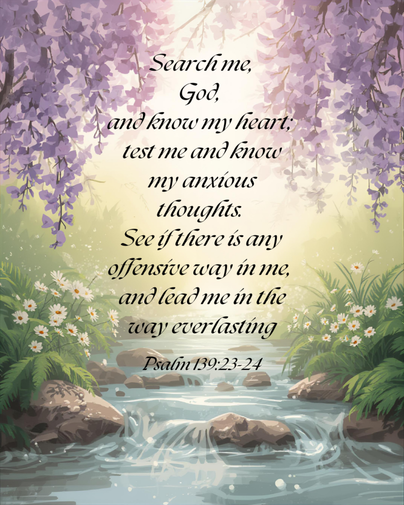 David models humility, trust, repentance, and transformation in these verses. Praying this prayer seems dangerous, but the holy request helps us draw nearer to our Maker. With God’s help, we can reach our full potential and achieve His purposes for our lives. We must let the Lord search our hearts, identifying the dark areas, and shedding His light into the deep recesses of our souls. If we allow the Lord complete access to our hearts, He will transform us, one day at a time. God not only gives us insight, but direction.