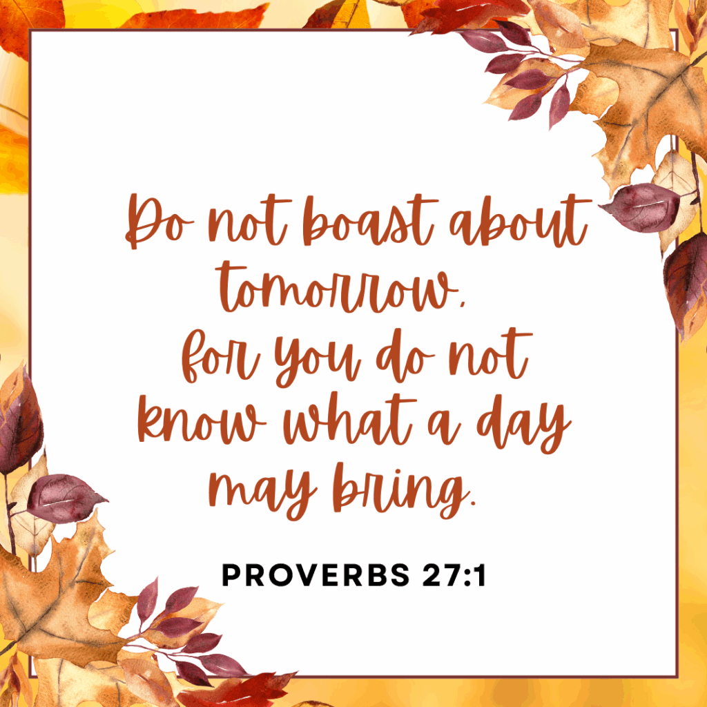 Instead of boasting about tomorrow, put it in the Lord’s hands and live in the moment. When speaking about the future, say, “God willing, I will do this or that.” Use the phrase as a reminder of today’s verse and the fragility of life. Don’t miss out on what the Creator has for you in this day, trusting He’s got the future covered.